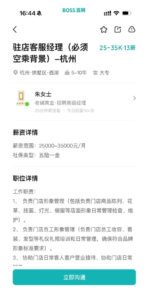 从老铺黄金的招聘信息来看,杭州大厦购物中心店和上海新天地店的驻店客服经理岗位,均要求有空乘背景,月薪在2.5万至3.5万元之间。据此估算,年薪在32.5万至45.5万之间。