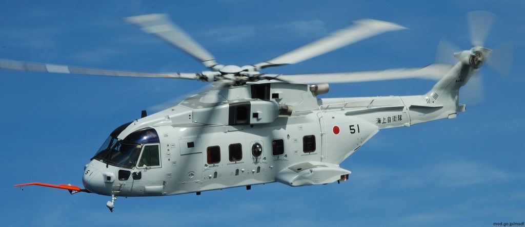 日本海上自卫队在2003年订购了14架飞机,用于空中反水雷(AMCM)和运输任务。AW101由川崎重工改装,日本防卫厅指定型号为MCH-101.特色包括旋翼和尾翼的自动折叠。对于猎雷任务,MCH-101配备了诺斯罗普·格鲁曼公司的AQS-24A机载猎雷系统和AN/AES-1机载激光探雷系统(ALMDS ),具有完整的从地面到底部的探雷能力,以及Mk-104声学扫雷装备。